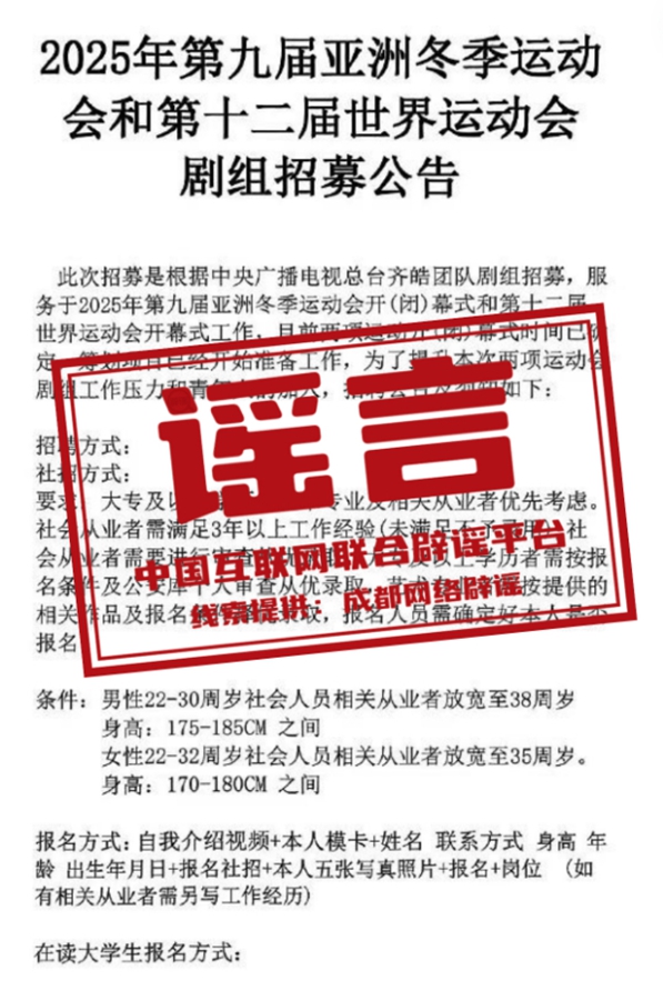 真相:近日,网络平台出现关于“2025年第12届世界运动会开幕式总导演人选及团队招募”的内容,引发网民关注。针对网传信息,2025年第12届世界运动会执委会通过“成都2025年世界运动会”官微发布声明称:近日,在网络平台出现关于“2025年第12届世界运动会开幕式总导演人选及团队招募”的内容均为不实报道,成都世运会未公布任何关于开幕式总导演人选的信息。(来源:“成都网络辟谣”微信公众号)