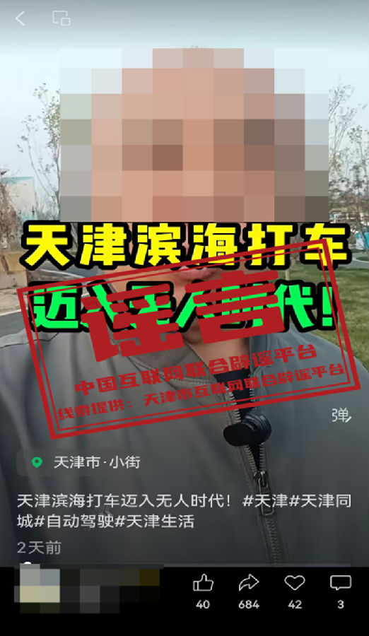 详情:近日,有短视频称“天津滨海打车迈入无人时代”。经当地交通运输部门核实,天津滨海新区目前暂无无人驾驶出租汽车运营,视频中相关信息不实。(来源:“滨海辟谣”微信公众号)