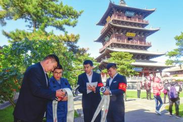 10月4日,大同市华严寺景区内工作人员正在检查消防、应急设备。国庆中秋长假期间,为确保游客安全和旅游秩序稳定,大同市各景区、景点开展全方位安全隐患排查整治,消除隐患风险。 张燕伟摄