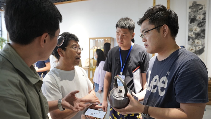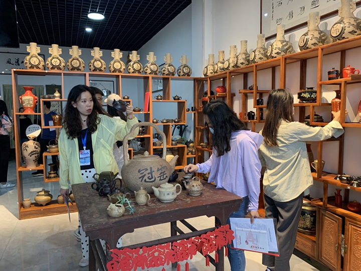 记者团成员在冠窑砂器陶艺有限公司采访。记者杨惠生摄