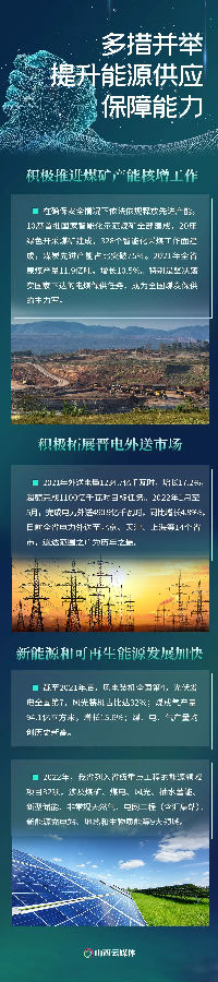 山西省扎实开展能源革命综合改革试点,推动传统能源和新能源清洁能源优化组合,坚定扛起保障国家能源安全的重大使命。如今的山西,煤炭先进产能占比突破75%,新能源和可再生能源装机占比达到34.3%。2021年,山西煤炭行业生产效率明显提升,原煤产量达到11.9亿吨,以长协价完成16省(区、市)4356万吨电煤保供任务,为国家稳定宏观经济大盘作出贡献。