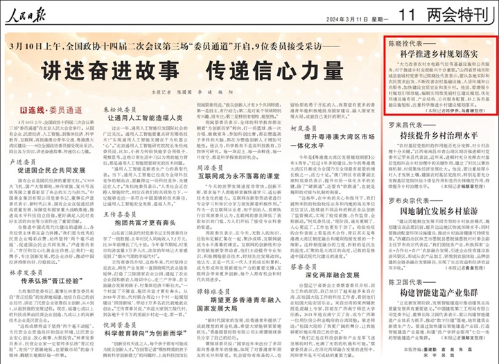 “大力改善农村水电路气信等基础设施和公共服务,对于推进乡村全面振兴十分重要。”山西省晋城市阳城县皇城村党委书记陈晓拴代表表示,要从各地实际和农民需求出发,不断改善农村基础设施、人居环境和公共服务,加快建设宜居宜业和美乡村。他说,要增强乡村规划引领效能,编制实用型美丽村庄建设规划,优化环境设施布局、产业结构、公共服务配置,补上各类基础设施短板,注重科学推进乡村建设规划落实。