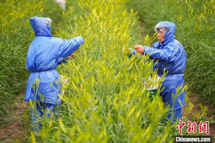 7月12日,山西大同云州区黄花进入丰收季,农民采摘黄花。大同是中国黄花主产地之一,有着约600年的黄花种植史。中新社记者 武俊杰 摄