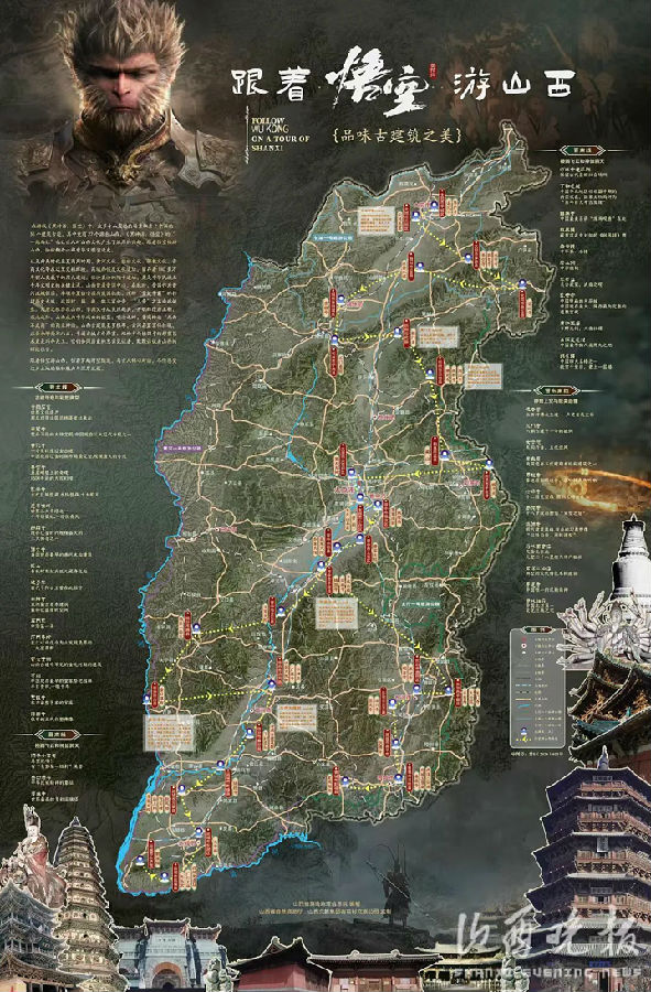 以黑色为底色,结合《黑神话:悟空》中紧箍咒、金箍棒、菩提老祖等游戏经典元素为背景,将33个古建点位中57个景点贯穿整幅地图……近日,由山西省测绘地理信息院全新打造的“跟着悟空游山西品味古建筑之美”山西古建筑地图正式面世。