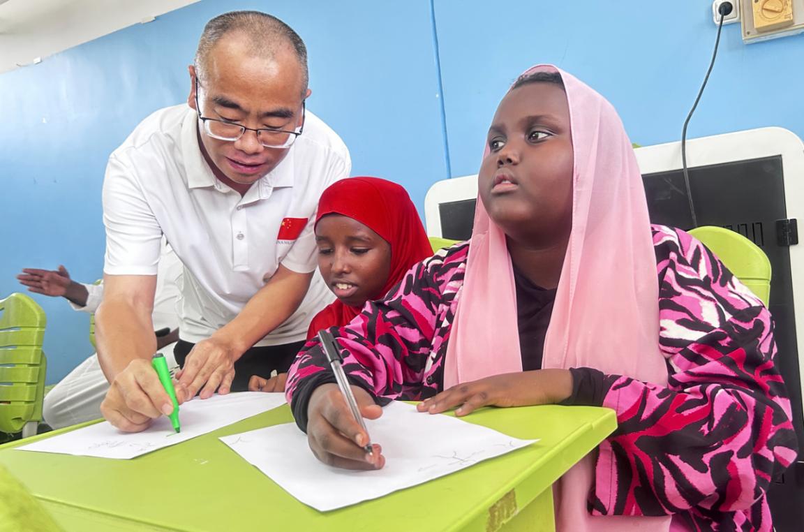 2025年5月,在吉布提一所特殊儿童学校,中国(山西)第23批援吉布提医疗队队员教孩子们书写汉字。(医疗队提供图片)