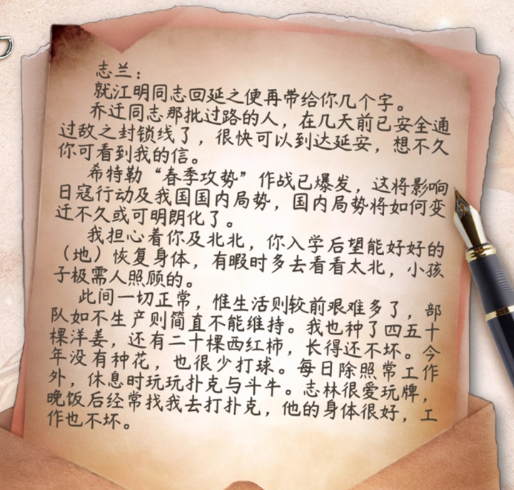 这封家书是1942年5月22日晚,即左权将军壮烈殉国前三天写给爱妻刘志兰的最后一封信,也是一封充满着爱情与亲情的遗书。