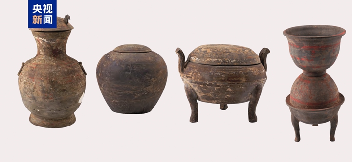 赵康村墓葬共出土器物76件,质地有陶、铜、石、铁等。所出器物,尤其是陶器,以仿铜礼器为主要组合方式,且器物皆放置于墓主人头部或头部一侧专设的耳室中,体现了战国以来传统葬制的延续。所出器物整体矮圆,流行装饰彩绘云气纹等,均为西汉前期的风格,且不见西汉中期以后流行的井、灶、仓。