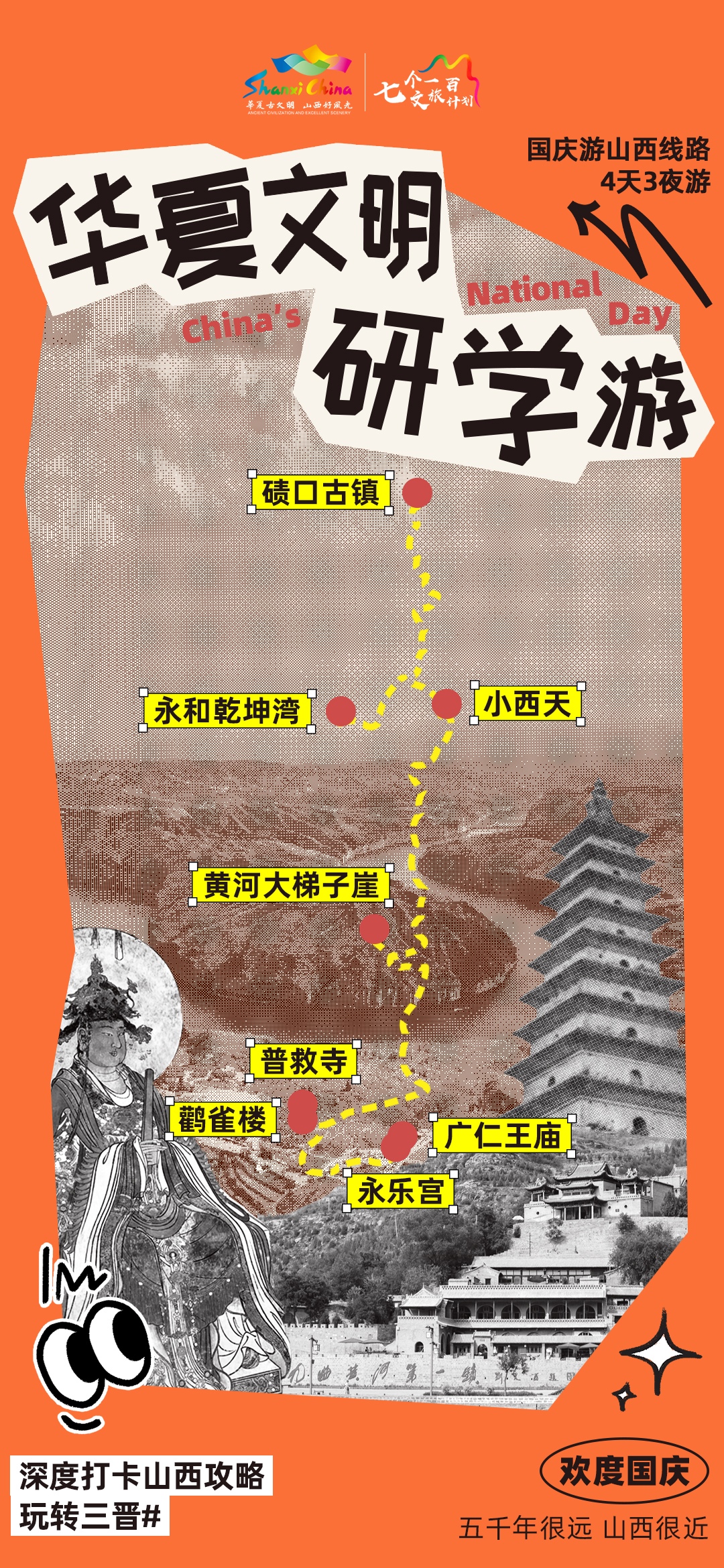 D1碛口古镇——D2永和乾坤湾——小西天——D3黄河大梯子崖——鹳雀楼——普救寺——D4永乐宫——广仁王庙