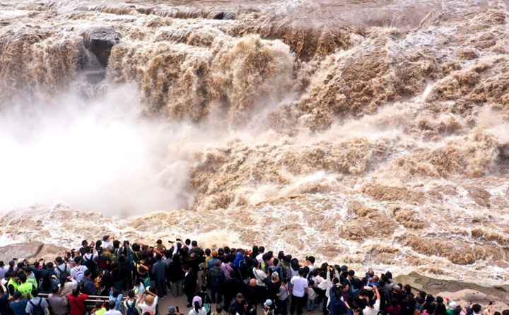 站在壶口瀑布岸边,只见宽阔的河道激流奔涌,瀑面明显抬高,绵延数百米,河水拍打着河床两壁,激起一团团黄色水花,水汽氤氲,勾勒出一幅惊涛拍岸、浊浪排空的壮美画卷。“尽管曾无数次地看到过壶口瀑布的照片,但只有当你站在壶口瀑布旁边,才认识到在咆哮怒吼的黄河面前,所有照片及文字都显得苍白无力。”来自山西太原的游客李芸说。(记者王飞航)