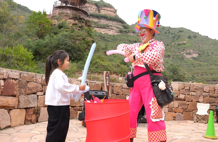 景区内的民俗文化广场上,旱船演员身着“国庆快乐”服饰推彩船,呼啦火圈表演者转“火环”,小丑捏主题气球、撒红色故事卡片。景区负责人表示,国庆期间民俗活动不断,景区同步设置红色讲解专场和非遗小吃区,打造“观表演、学历史、品美食”一站式体验。