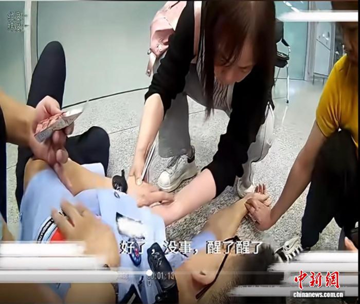 现场,两人默契配合,分工明确:一人迅速按压人中施救,一人立即检查生命体征。确认其呼吸、脉搏平稳且无明显外伤后,她们轻轻将患者平放于地。然而险情并未解除——患者接连两次突发抽搐,千钧一发之际,两人沉着冷静,果断托起其下颌,畅通呼吸道,为后续救治抢下宝贵时间。