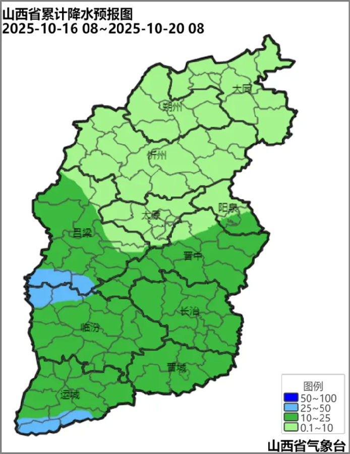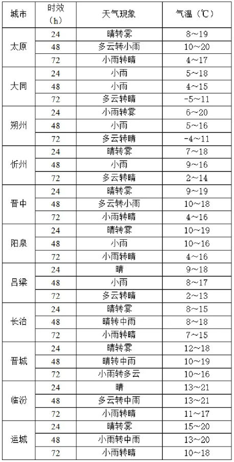 全省多云转阴天,有阵雨或小雨,中部局部和南部大部分地区有中雨,吕梁、临汾、运城等地的局部地区有大雨;降水间歇北部局部和中南部部分地区有雾或轻雾。