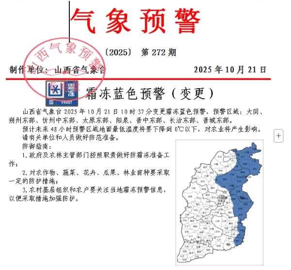 山西省气象台2025年10月21日10时37分变更霜冻蓝色预警,预警区域:大同、朔州东部、忻州中东部、太原东部、阳泉、晋中东部、长治东部、晋城东部。预计未来48小时预警区域地面最低温度将要下降到0℃以下,对农业将产生影响。请有关单位和人员做好防范准备。