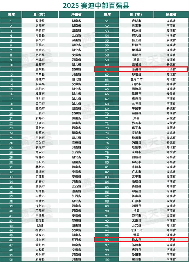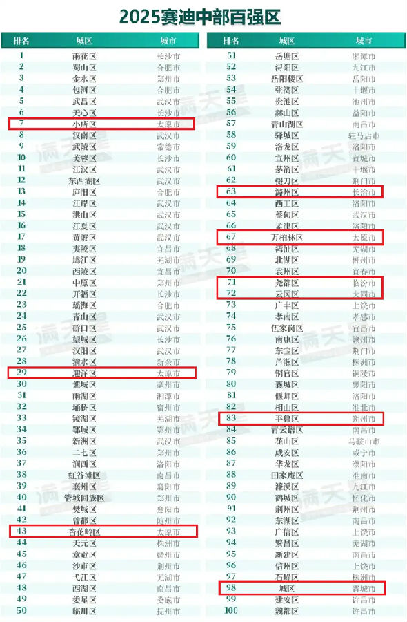 近日,赛迪顾问发布2025中西部县域、城区经济高质量发展研究成果,中部百强县、中部百强区等榜单出炉。山西省泽州县、沁水县上榜中部百强县榜单,分别位列第61、第96位;太原市小店区、迎泽区、杏花岭区、万柏林区,长治市潞州区,临汾市尧都区,大同市云冈区,朔州市平鲁区,晋城市城区9个区上榜中部百强区榜单。