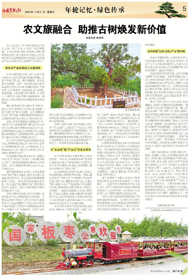 在山水之间,千年古树与特色农产品正上演一场 “文化 + 农业”的品牌联姻。古老的枣树、梨树、核桃树、柿树、槐树等见证着三晋大地的岁月变迁,它们也成为农产品品牌建设的文化锚点,让我省农产品在市场中烙上独特的“文化印记”。