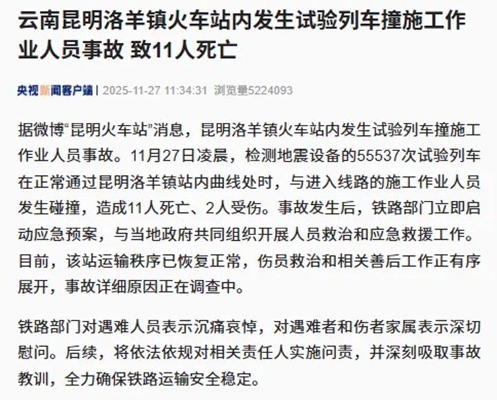 根据央视新闻及昆明火车站官方微博通报,2025年11月27日凌晨,55537次试验列车在云南省昆明市洛羊镇火车站内通过曲线处时,与进入线路的施工作业人员发生碰撞,造成人员伤亡。