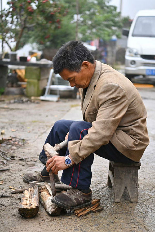 他像一个心无杂念的孩童,沉浸在手上的活计里。风声、雨声、围观的邻居,无法惊扰半分。砸了33下,一根直径十来厘米的圆木,被他劈成两半。