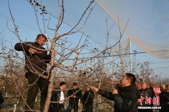 李新田为果农示范果树如何剪枝。王晋元 摄