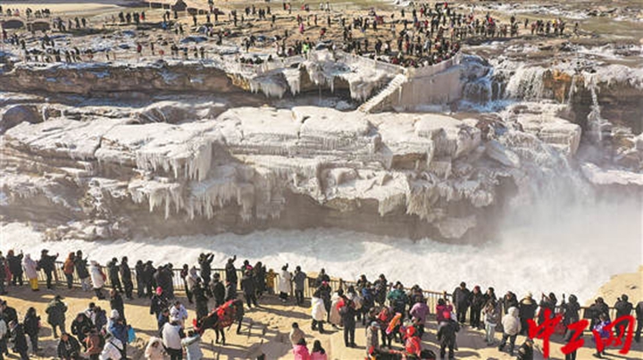 12月27日,游客在山西吉县黄河壶口瀑布景区游览观瀑(无人机照片)。