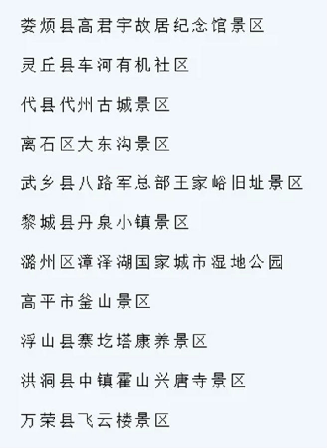 12月29日,山西省文化和旅游厅网站发布《山西省文化和旅游厅关于确定11家旅游景区为国家4A级旅游景区的公告》。根据中华人民共和国国家标准《旅游景区质量等级划分》和《旅游景区质量等级管理办法》,经有关市文化和旅游行政部门推荐,山西省文化和旅游厅按程序组织综合评定,以下11家旅游景区达到国家4A级旅游景区标准要求,正式确定为国家4A级旅游景区。