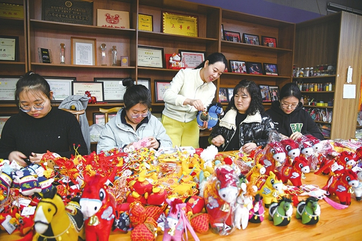 1月2日,山西运城闻喜县省级非遗代表性传承人张静的工作室内,大家正在赶制、销售非遗“马”布艺文创产品。随着春节临近,以马为原型设计的布艺小马文创产品,凭借吉祥美好的寓意受到消费者青睐。(温徐旺)