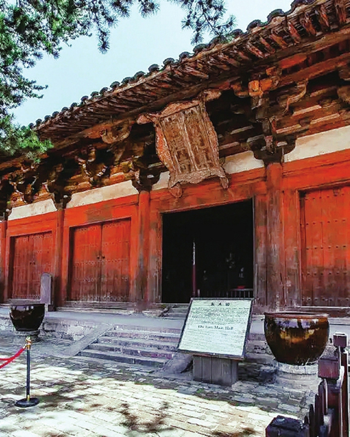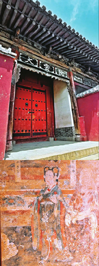 深藏于龙耳山中的大云院弥陀殿,因殿内留存有五代壁画而闻名于世,这是迄今所知,我国古代佛寺殿堂中仅存的五代壁画,弥足珍贵。东壁《维摩经变》描绘维摩诘与文殊菩萨辩论的场景,人物神情生动,线条承袭晚唐“焦墨薄彩”风格,并在重要部位施以沥粉贴金,可谓“满壁风动”。