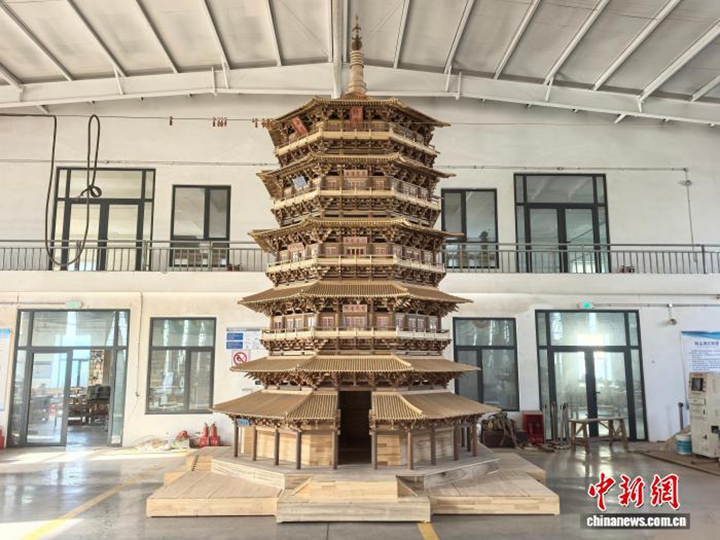 图为一座严格按照1:8比例全木榫卯复制的应县木塔模型。中新社记者 胡健 摄