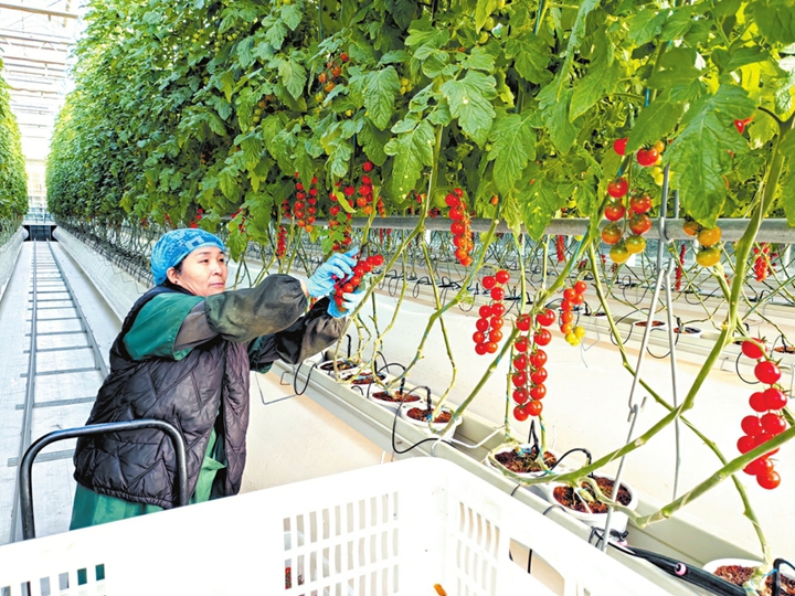 ⑤张云亲在智能化玻璃温室内采摘串收小番茄。高桦摄