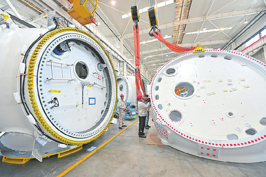 工人在位于山西转型综合改革示范区的太重集团新能源产业园区吊运风电装备。新华社记者杨晨光摄