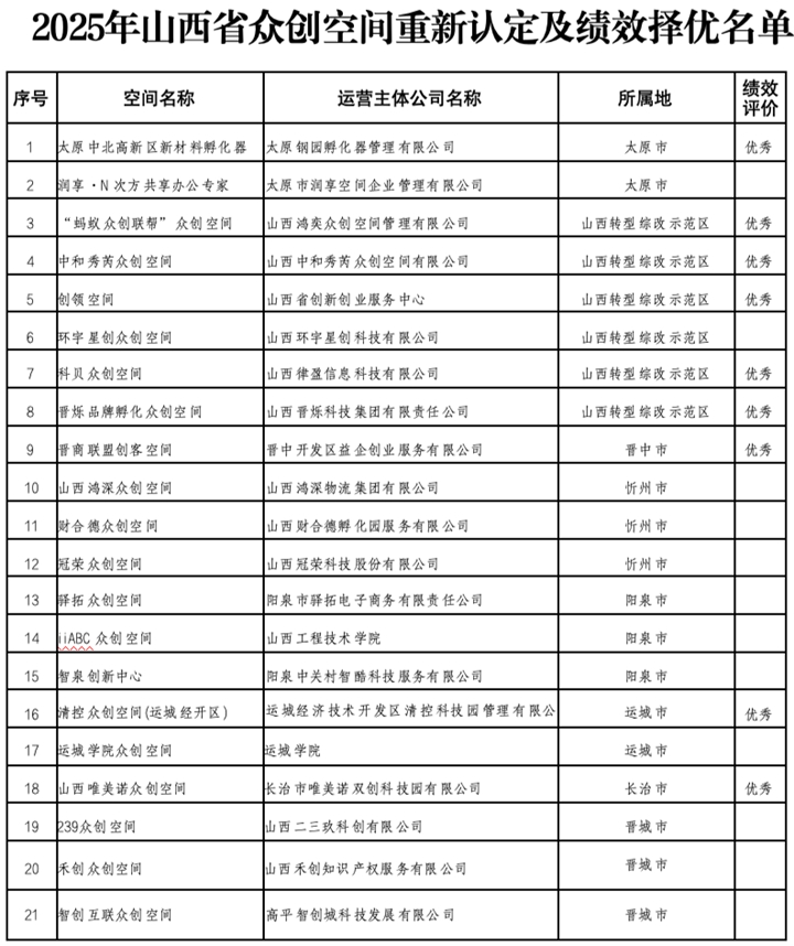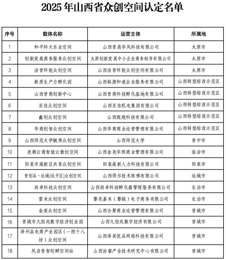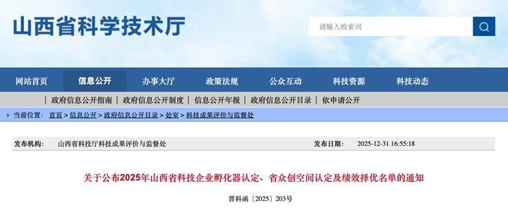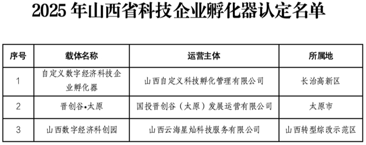 山西公布2025年省科技企业孵化器认定、省众创空间认定及绩效择优名单