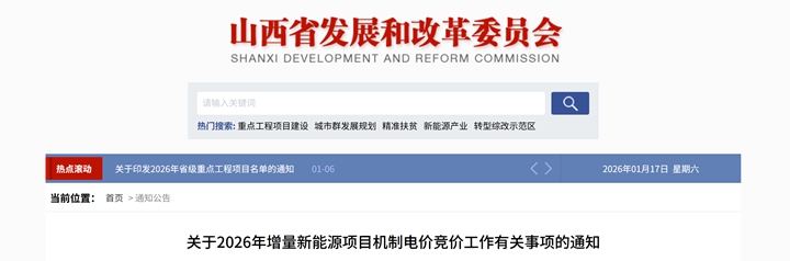 近日,山西省发展改革委印发通知,就2026年增量新能源项目机制电价竞价工作有关事项进行部署。