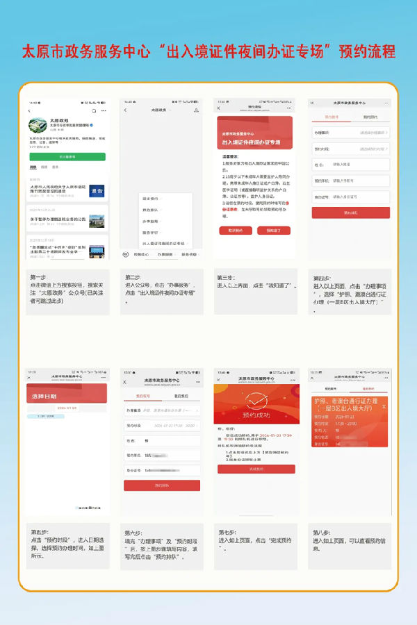 微信搜索“太原政务”微信公众号,关注后在下方点击“办事服务”,选择“出入境证件夜间办证专场”模块,在线预约成功后前往大厅排号办理。