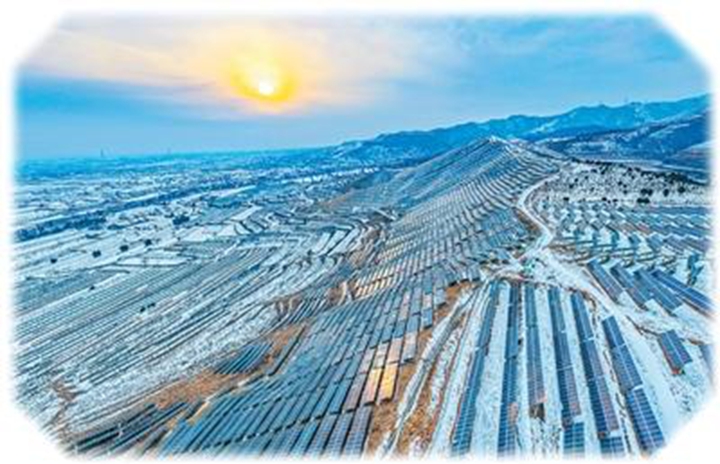 1月21日,在山西省运城市芮城县国家光伏领跑技术基地,连绵的光伏阵列在白雪映衬下熠熠生辉。