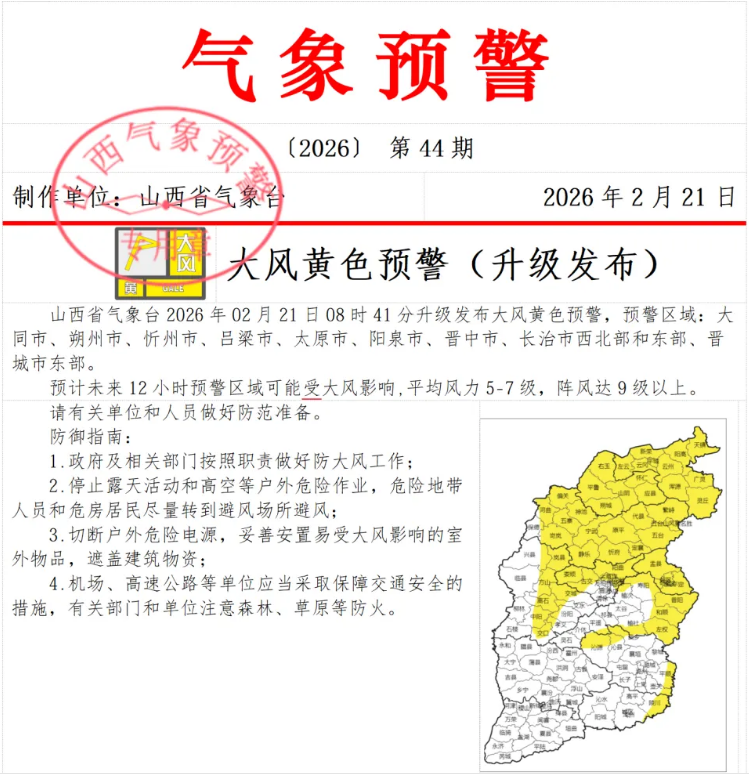 山西省气象台2026年02月21日08时41分升级发布大风黄色预警,预警区域:大同市、朔州市、忻州市、吕梁市、太原市、阳泉市、晋中市、长治市西北部和东部、晋城市东部。
