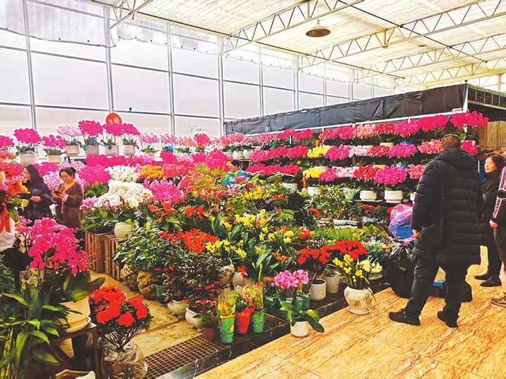各类年宵花或雍容华贵,或清新雅致,争奇斗艳、次第绽放。店家特意在花枝上挂起“平安喜乐”“龙马腾飞”“财源广进”“福气盈门”“要啥有啥”等祝福语标签,醇厚的年味扑面而来。