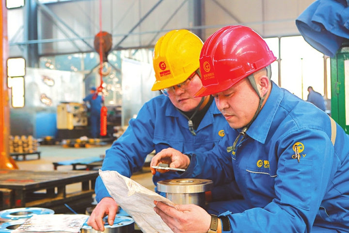 刘振伟(右)按照图纸测量法兰。本报记者李春泽摄