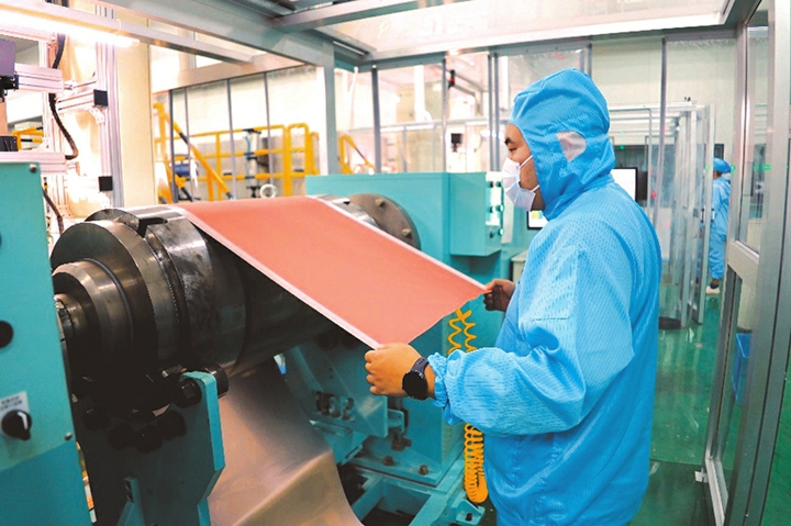 铜箔事业部经理助理杨景召穿梭在生产线之间,不时与工人交流几句。他告诉记者,从今年年初开始,生产线就未停歇。“客户等着我们的产品,尤其是新能源电池和5G基站领域,铜箔是重要材料,我们必须确保按时交付。”