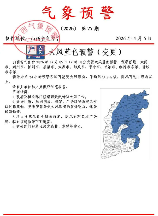 山西省气象台2026年04月05日17时10分变更大风蓝色预警,预警区域:大同市、朔州市、忻州市、吕梁市、太原市、阳泉市、晋中市、长治市、临汾市东部、晋城市东部。