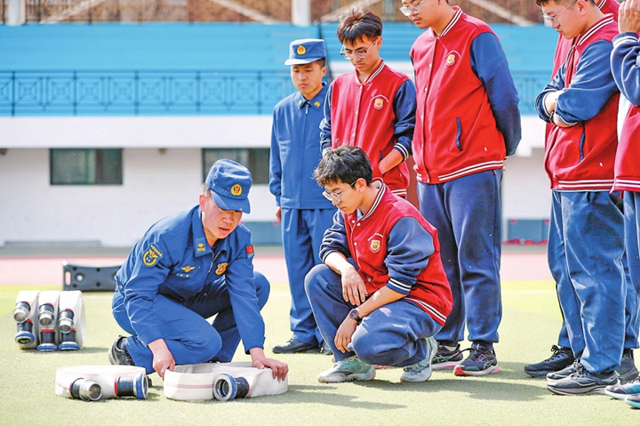 消防员向同学们讲解消防水带的使用方法。本报记者王瑞瑞摄