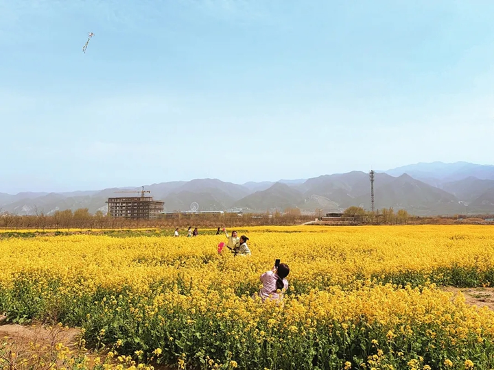 盐池南畔,金色花浪与巍巍中条山相映成画,游客正踏春赏景。