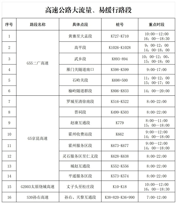 4月30日(假期前一日)全省高速公路、普通国省道、出城路口、城区主要道路将迎来出行流量预热,16时至20时流量达到峰值。