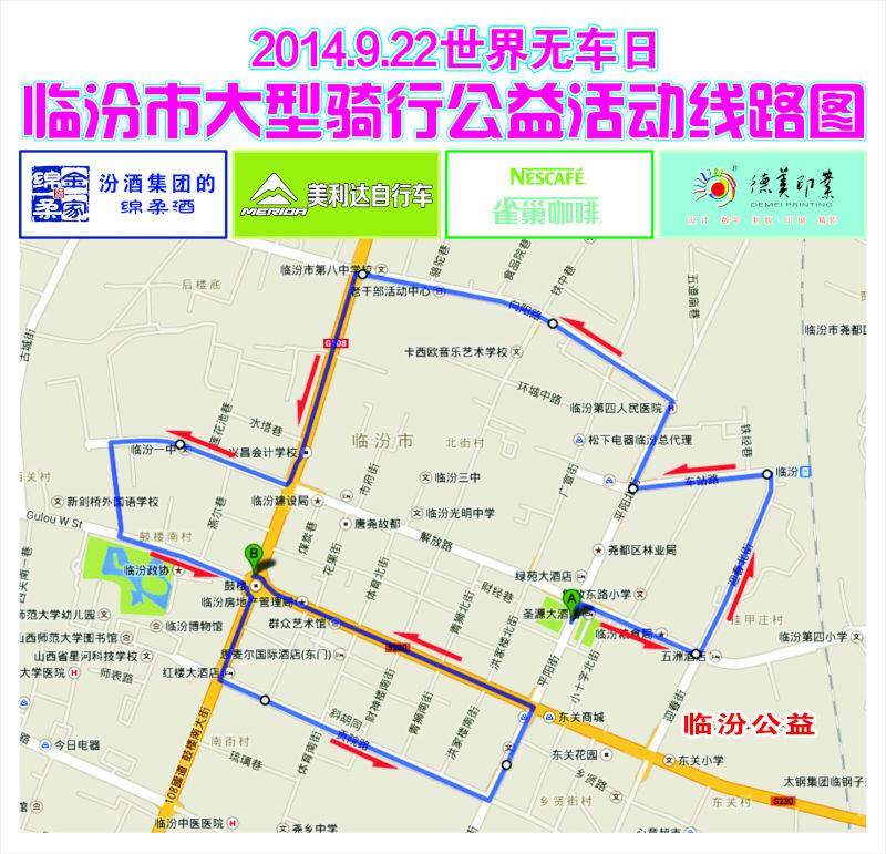 2014无车日临汾市大型骑行公益活动是由临汾市公益文化传播协会、美利达自行车俱乐部联合主办,市民自发参与通过骑行这种方式,旨在宣传绿色出行理念,号召更多市民加入低碳出行的队伍。以“我们的街道,我们的选择”为主题,旨在号召市民选择步行、自行车、公共交通等绿色方式出行。
