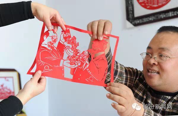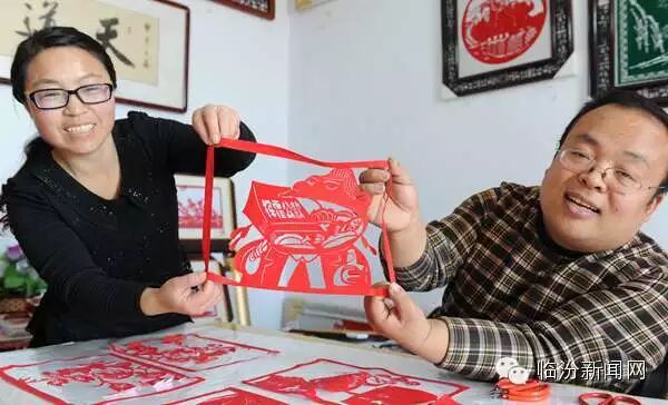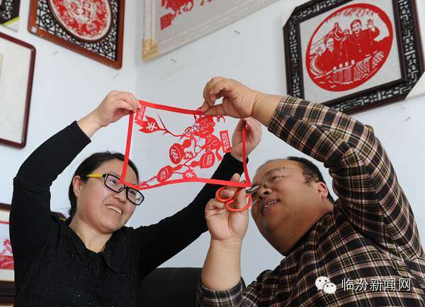 12月7日, 山西省临汾市浮山县剪纸艺人梁剑和爱人刘亚丽在研究创作《巡视组》剪纸作品