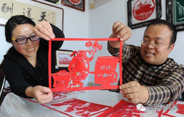 梁剑和刘亚丽在展示《离任审计》剪纸作品